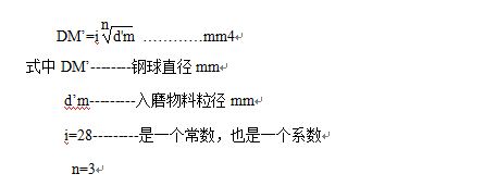 研磨體尺寸的大小和欲磨細(xì)物料的粒度間有一定關(guān)系。根據(jù)粉碎理論,體積假設(shè)及假想的“聚積層”的關(guān)系,可以理論上演證出來(lái)物料粒度與研磨尺寸間的關(guān)系(計(jì)算公式略)。另外,F(xiàn)C邦德萊專家學(xué)者提出計(jì)算公式。筆者根據(jù)多年實(shí)踐使用KA拉朱莫夫公式較為簡(jiǎn)便。計(jì)算公式如下: